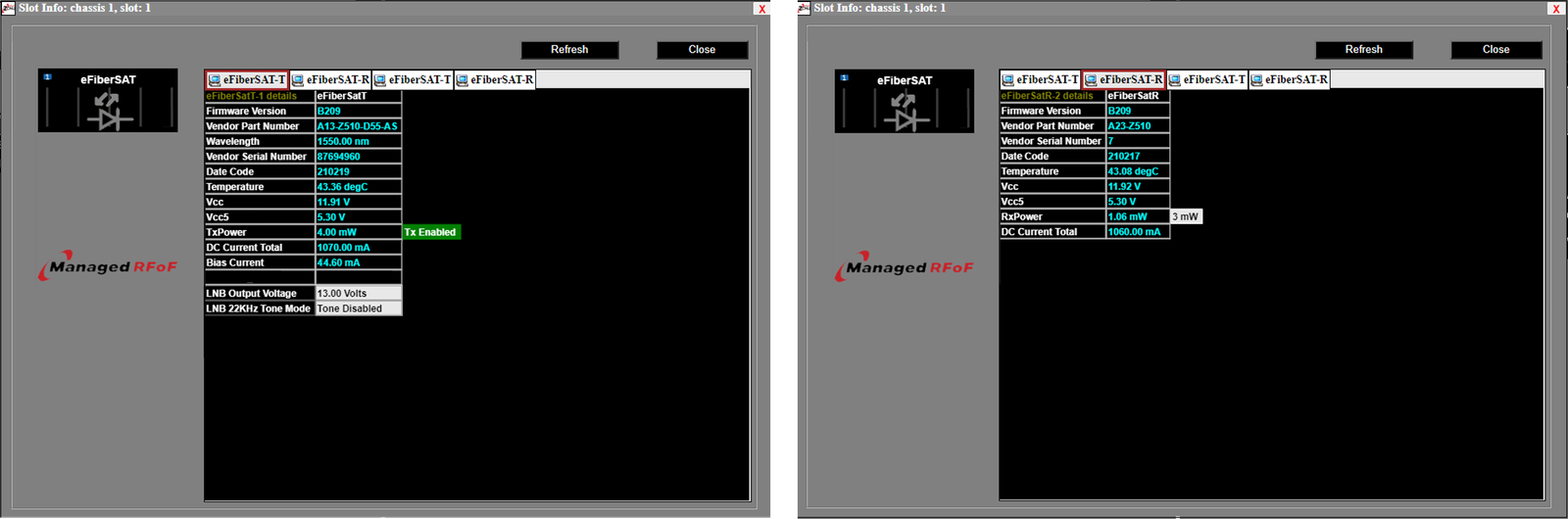The figures below represent typical Managed RFoF™ eFiberSat ODU transmitter (downlink, left) and receiver (uplink, right) subslot information windows that are accessed remotely.