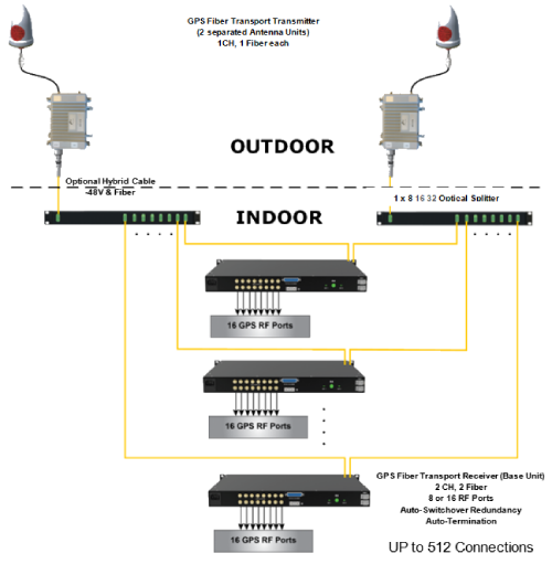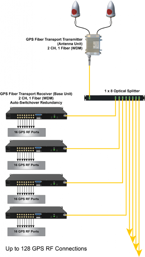 Figure 1: GPS over fiber network – single fiber 8 splits ->128 endpoints redundant Antenna/Transmitter/Receiver.