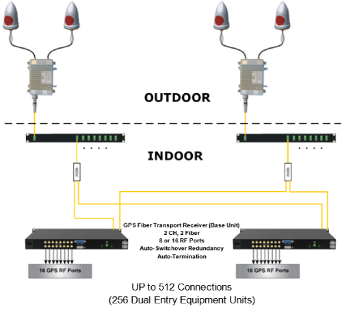 Up to 516 service points are served by 4 independent antennas located far apart from one another on different structures.  In this architecture, the antenna pairings have completely independent circuitry and transmit at a different wavelength. Each antenna’s pair optical signal is split, combined with a signal from the other location and a signal from each location is delivered to a receiver with 16 RF outputs.  The full redundancy goes from the antenna to the two receivers, each completely independent from its pair.  Equipment with dual GNSS timing inputs can be connected to two independent outputs for full redundancy so any element of the network can be replaced without interruption.