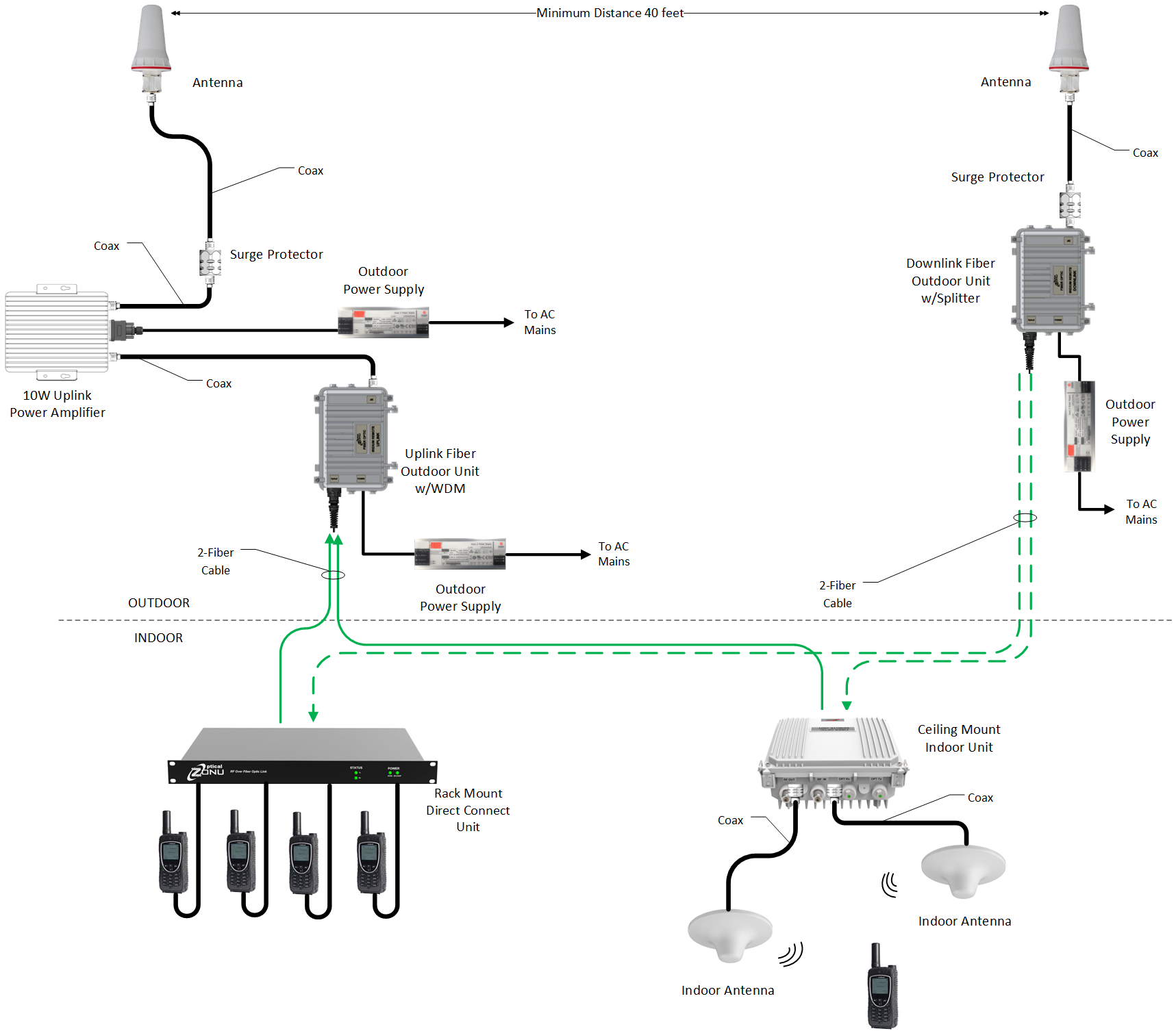 Fiber transmitters feature linear uncooled isolated DFB laser diodes. Receivers feature high performance InGaAs photodiodes. The standard RF interface to the indoor 19” 1RU chassis is 50Ω SMA. The 19” chassis is powered by dual AC or –48 VDC (optional) power supplies. Outdoor equipment as well as the indoor ceiling mount re-radiating termination are powered from +12 VDC.