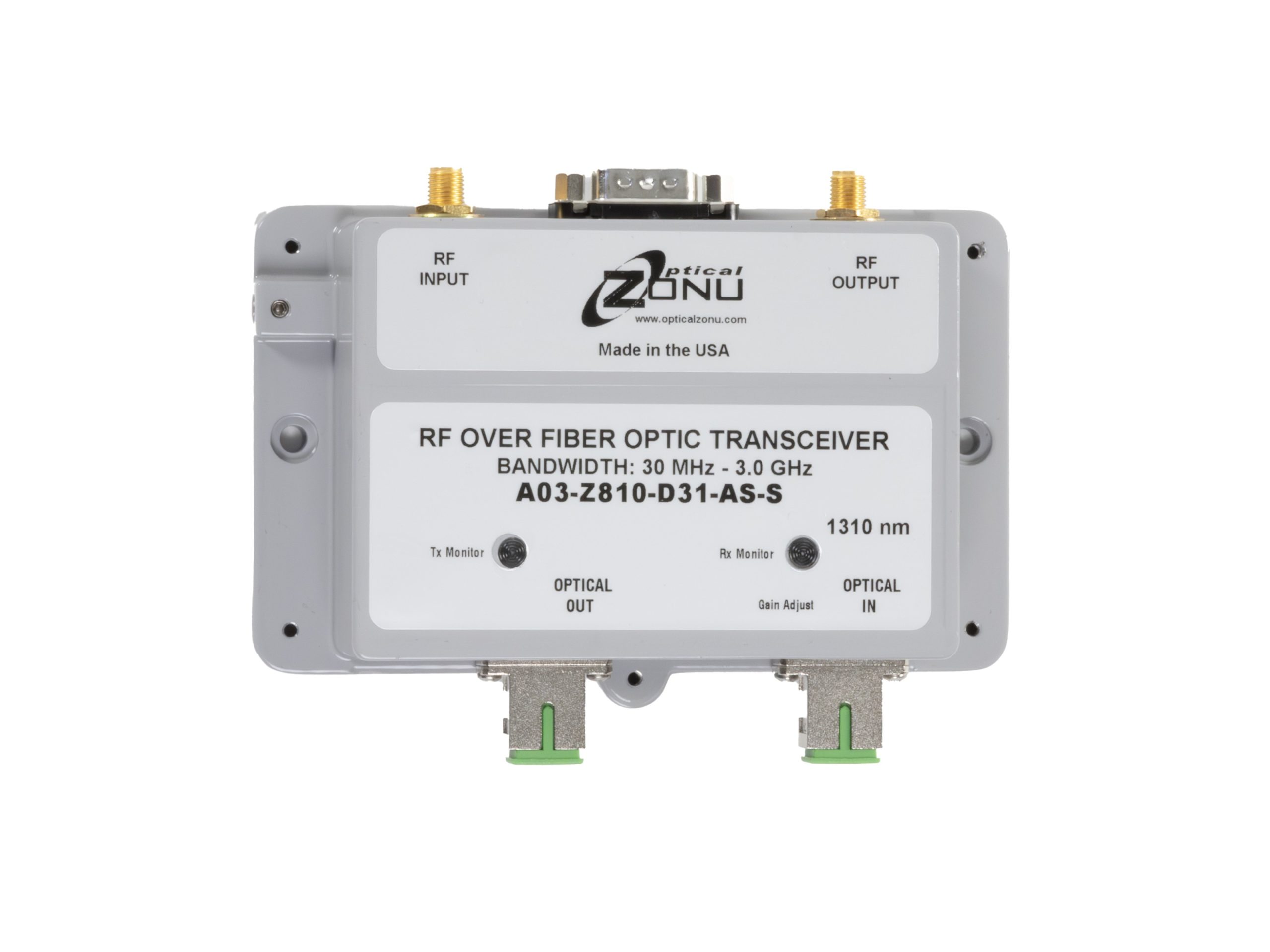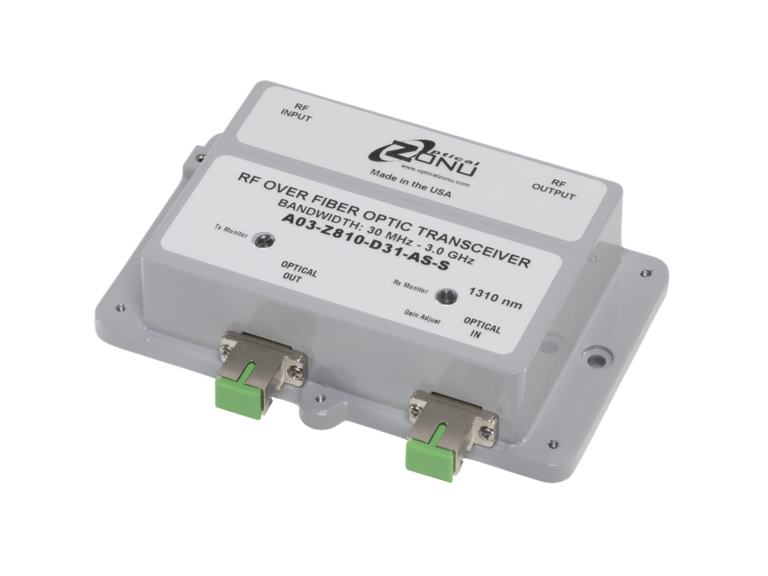 CWDM wavelengths are also available. Transceivers may be configured with an internal WDM to support bidirectional traffic on a single fiber. Standard transport is over 9/125 μm Single Mode Fiber, however Multimode fiber transport is also an option for 3 GHz models (contact Optical Zonu for details). The standard RF interface is 50 Ohm SMA and the standard optical interface is SC/APC (FC/APC is also available).