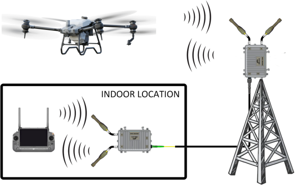 Markets for drone applications are expanding more and more every year. Optical Zonu has developed technology to transmit and receive drone control signals over fiber optic cable. The ability to control remote drone systems over fiber expands the potential applications for this technology. The technology works by providing a bi-directional RF path for the 2.4 and 5.8 GHz unlicensed ISM bands. The path is optimized transport the unlicensed control bands provided by the drones. The system can be used to control drones over a wide area, and in non-line of sight applications. Drone over fiber systems are complex and an experienced sales engineer can help configure a system for you.