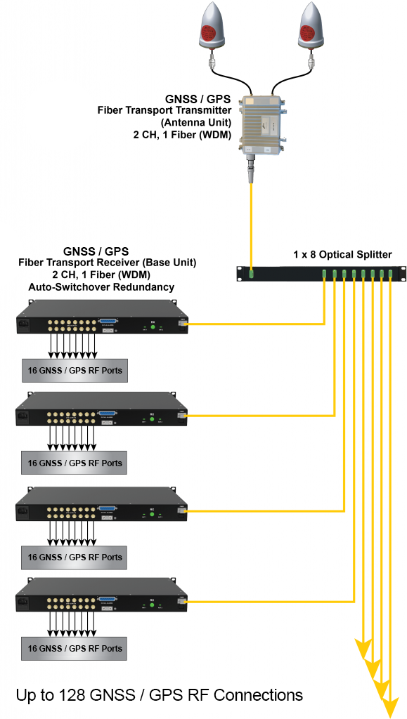 The Base Unit RF outputs connect to your GNSS / GPS receivers or base station equipment. The Base Unit is available with up to 1 to 16 RF outputs for point-to-point or point-to-multipoint connections. In addition, the fiber optic cable can be split up to 8 ways (16 splits are available for special order). The combination of optical and RF splitting permits easy routing of the GNSS / GPS over thin optical fiber while providing the lowest cost per connection. This makes the solution ideal for C-RAN hubs and base station hotels. The Base Units are simply distributed in the racks with the BBUs or eNodeBs so the final connections require only lightweight, short RF jumpers. The transport is NEBS Level 3 certified permitting installation in Central Office environments and can be conveniently rack mounted.