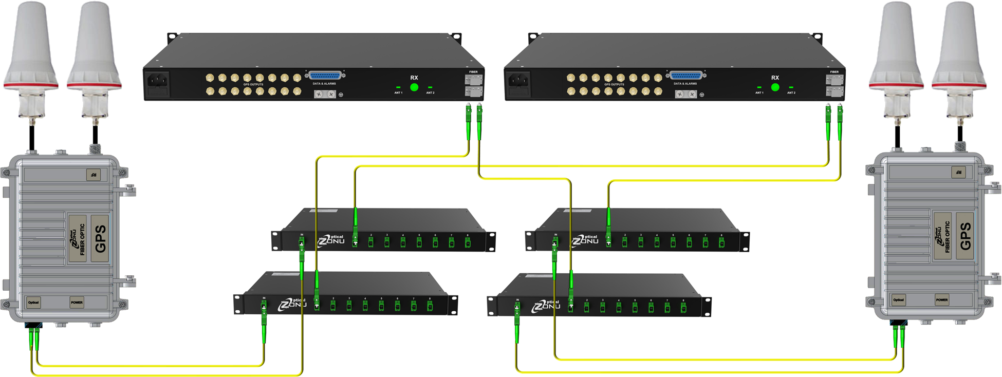 For applications that require the highest levels of reliability and redundancy Optical Zonu offers a carrier grade line of GPS equipment designed for use in cellular and datacenter applications. These types of systems are designed where every level of hardware is fully redundant. Multiple transmitters can be installed on different power sources in different locations of the roof to guarantee that service never goes down. The rackmount receivers have multiple power supplies as well as multiple optical receivers. A common output path can be fed with an RF auto switch that will automatically provide a good signal at the output.