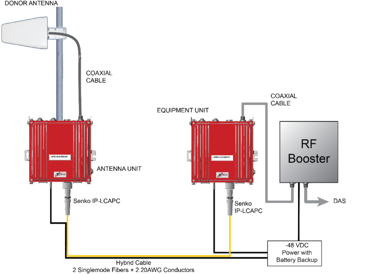 In some cases, a coaxial cable connection between the donor antenna and the RF booster is not practical or possible to provide the coverage needed. This is usually because the cable run is too long making the RF losses too high. In these cases, Optical Zonu’s Antenna Extender provides a drop-in solution.